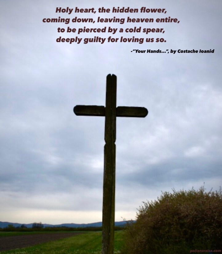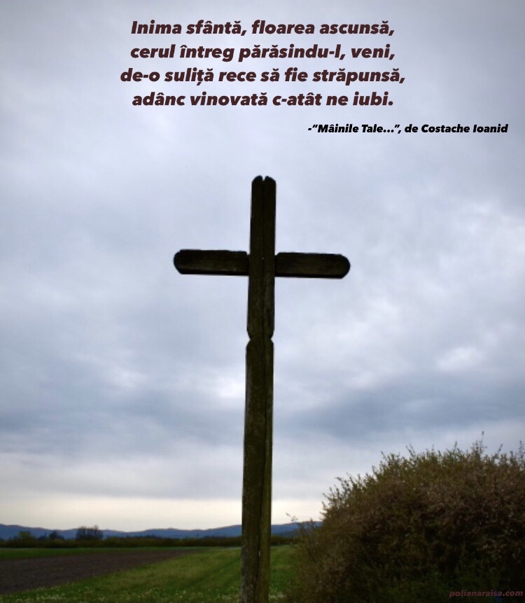 Your hands... by Costache Ioanid Your hands, sweet Jesus, hands who created us from clay, they stretched out on the wood to be pierced oh, Your hands who gave it all! Your ankles, tired ankles, full of dust, of thorns, of longing, on the wood of shame stood pinned, as the lawful reward of their love... The clear forehead like blue horizons, full of mercy deeply bowed, receiving the crown of our mockery as an Emperor’s highest triumph. Your lips, on which sat the holy words from heaven, tasted the cup of sorrows and hatred Forgiving, letting out rivers of blood. Holy heart, the hidden flower, Coming down, leaving heaven entire to be pierced by a cold spear deeply guilty for loving us so. The Love born from the Father, cries up till this day, sighing. But any soul that hears and believes, In the holy love finds wholesome comforting.