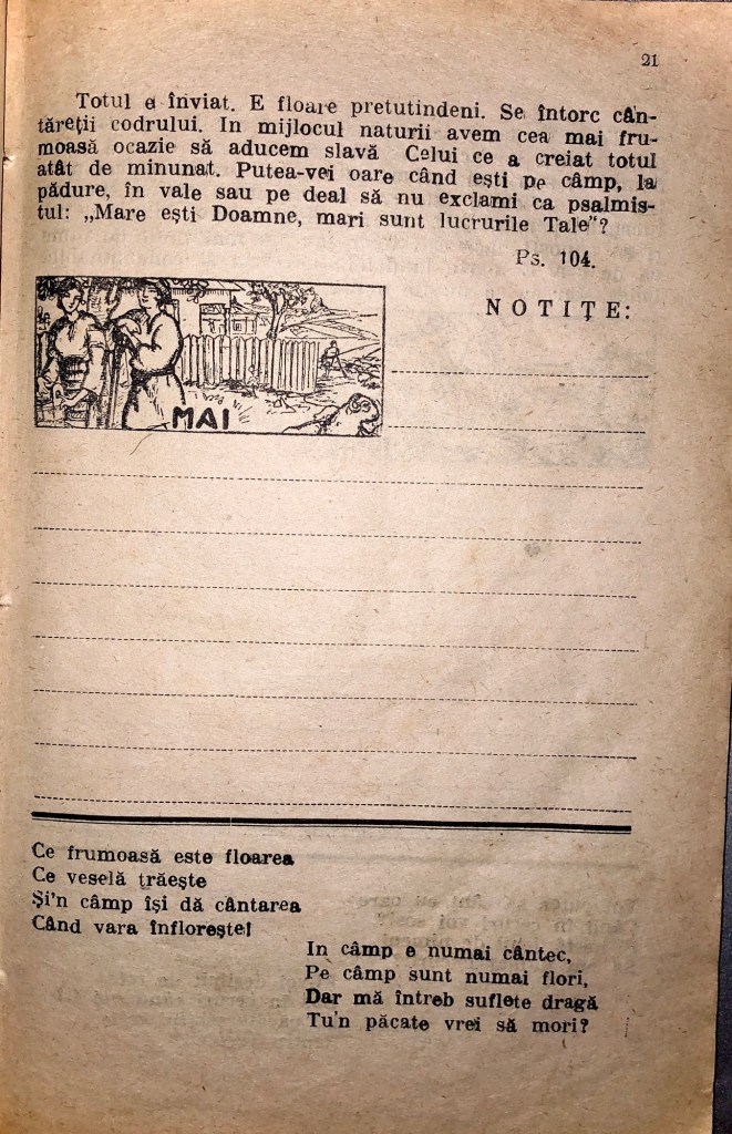 Totul a înviat. E floare pretutindeni. Se întorc cântăreții codrului. În mijlocul naturii avem cea mai frumoasă ocazie să aducem slavă Celui ce a creat totul atât de minunat. Putea-vei oare când ești pe câmp, la pădure, în vale sau pe deal să nu exclami ca psalmistul: “Mare ești Doamne, mari sunt lucrările Tale.”? (Psalmul 104)