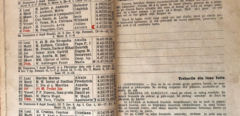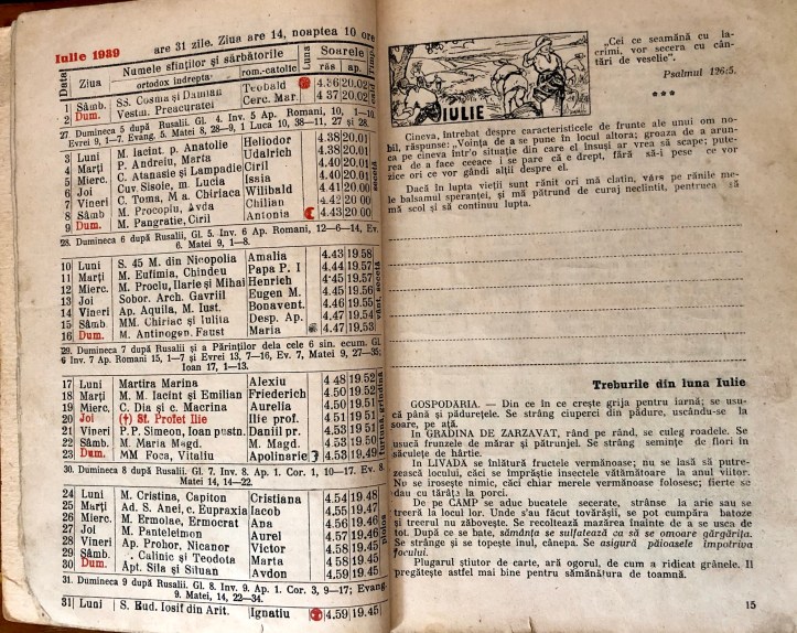 Câmpul – se aduc bucatele secerate, strânse la arie sau se treeră la locul lor. Unde s-au făcut tovărășii, se pot cumpăra batoze și treerul nu zăbovește. Se recoltează mazărea înainte de a se usca de tot. După ce se bate, sămânța se sulfatează ca să se omoare gărgărița. Se strânge și se topește inul, cânepa. Se asigură păioasele împotriva focului.