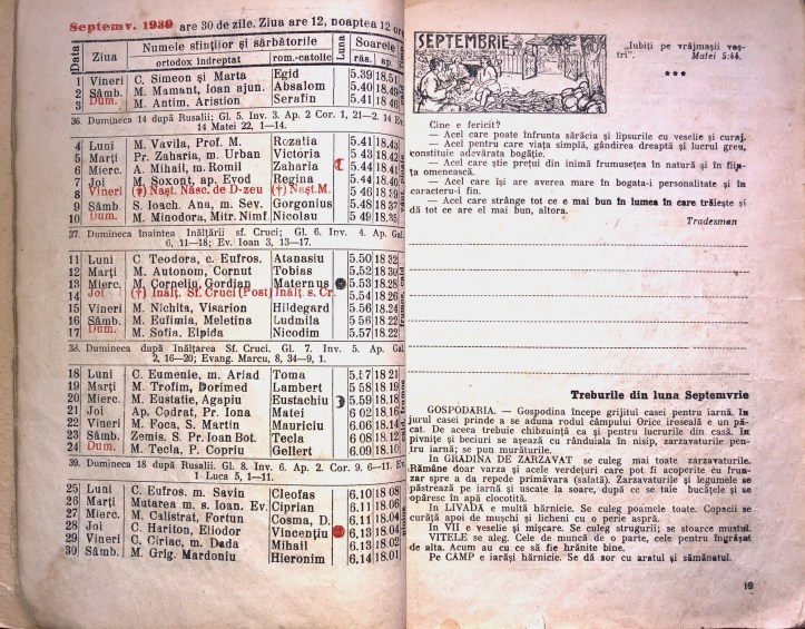 Gospodăria – gospodina începe grijitul casei pentru iarnă. În jurul casei prinde a se aduna rodul câmpului. Orice iroseală e un păcat. De aceea trebuie chibzuință ca și pentru lucrurile din casă. În pivnițe și beciuri se așează cu rânduială în nisip, zarzavaturile pentru iarnă; se pun murăturile.