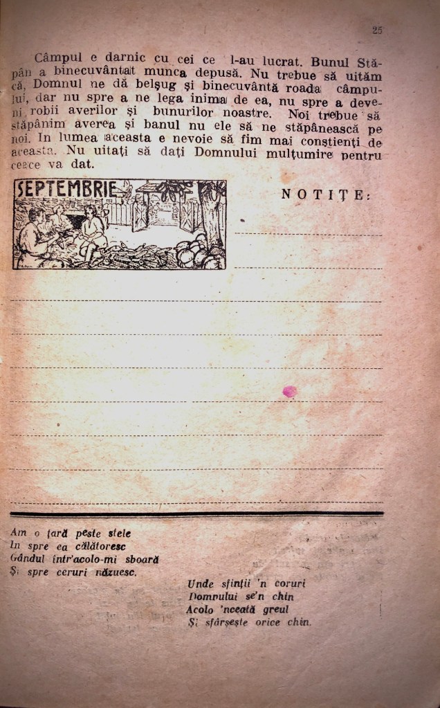 Câmpul e darnic cu cei ce l-au lucrat. Bunul Stăpân a binecuvântat munca depusă. Nu trebuie să uităm că Domnul ne dă belșug și binecuvântă roada câmpului, dar nu spre a ne lega inima de ea, nu spre a deveni robii averilor și bunurilor noastre. Noi trebuie să stăpânim averea și banul, nu ele să ne stăpânească pe noi. În lumea aceasta e nevoie să fim mai conștienți de aceasta. Nu uitați să dați Domnului mulțumire pentru ceea ce v-a dat.