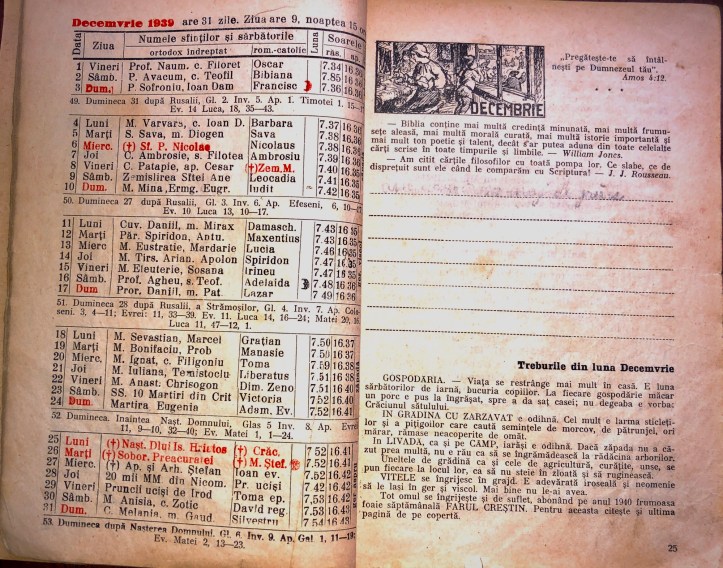 Gospodăria – viața se restrânge mai mult în casă. E luna sărbătorilor de iarnă, bucuria copiilor. La fiecare gospodărie măcar un porc e pus la îngrășat, spre a da saț casei; nu degeaba e vorba: Crăciunul sătulului.